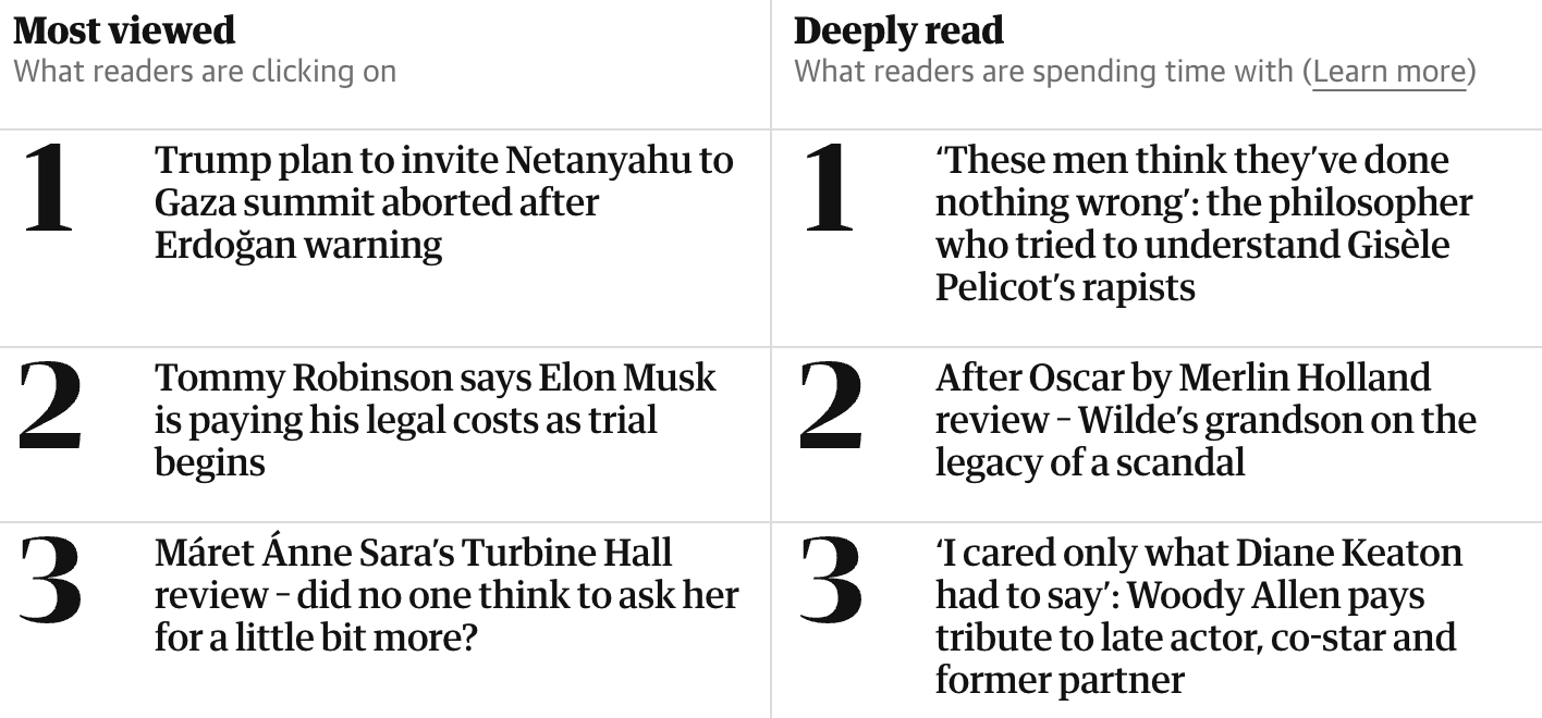 Incidentally, the place where that headline appeared – the most viewed list on the site’s nearly-infinite homepage (someone leak me the heat map, ask for my Signal handle) – has a cool companion component that ranks stories by how “deeply read” they are. In short, it’s a list of stories that readers spent a lot of time with and allows less grabby pieces to surface.