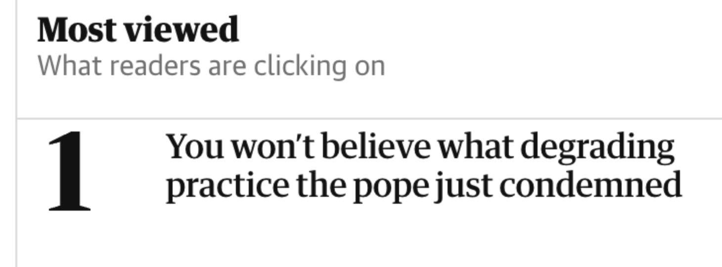 Absolutely beautiful stuff here from the Guardian, which used the below headline on a story about the Pope slagging off clickbait.